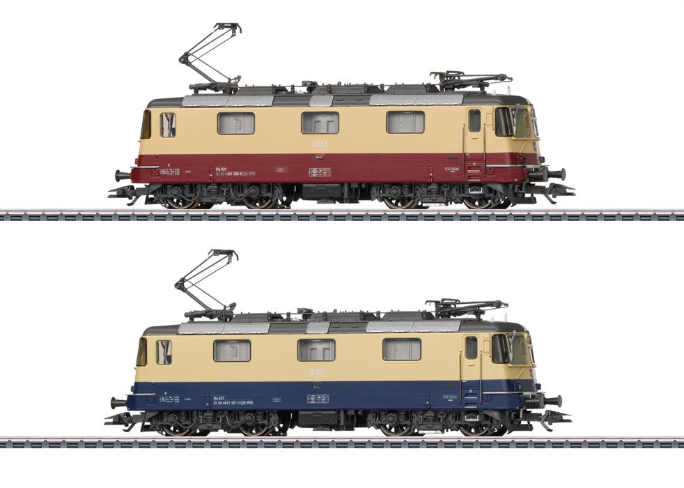 Vorbild: 2 Elektrolokomotiven Re 421 in unterschiedlichen Farbgebungen. 1 Elektrolokomotive in TEE-Farbgebung purpurrot/beige mit der Betriebsnummer 421 393-0 und 1 Elektrolokomotive in Rheingold-Lackierung kobaltblau/beige mit der Betriebsnummer 421 387-2. Privatbahn-Lokomotiven der International Rolling Stock Investment GmbH (IRSI), betrieben von der TR Trains Rail AG. Betriebszustand um 2020.