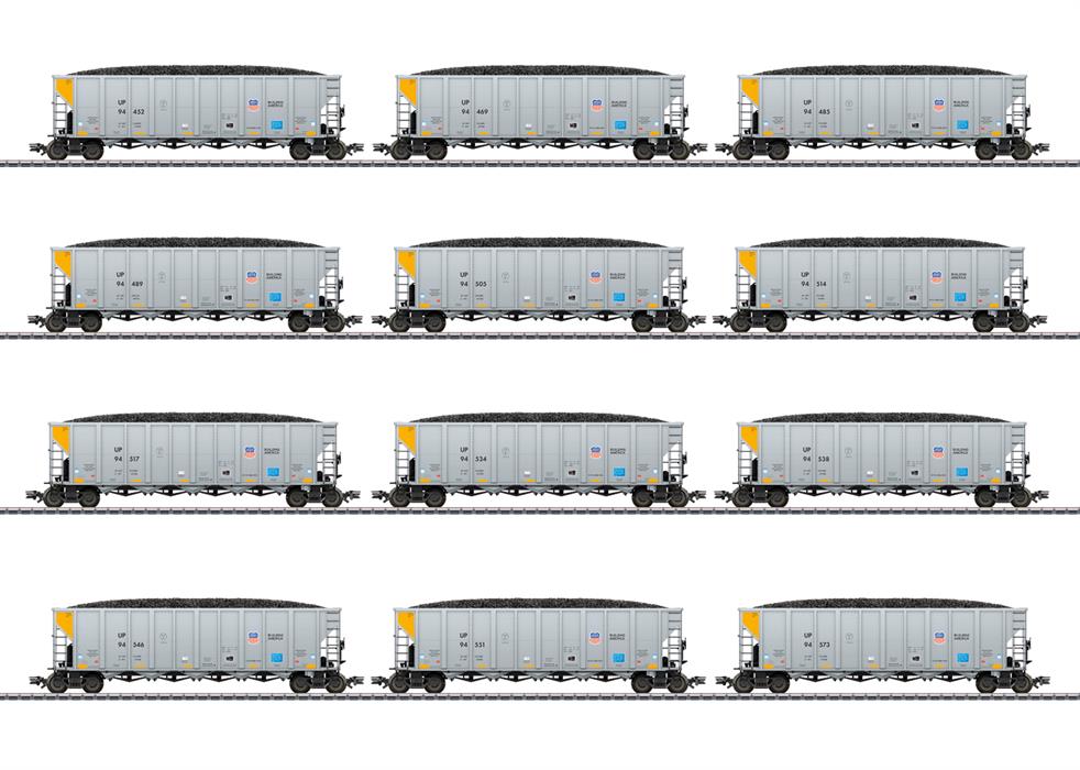 Vorbild: Zwölf Kohletransportwagen, sogenannte Hopper Cars, der Union Pacific Railroad (UP). Ausführung mit fünf Entladeeinrichtungen am Wagenboden. Aktueller Betriebszustand.