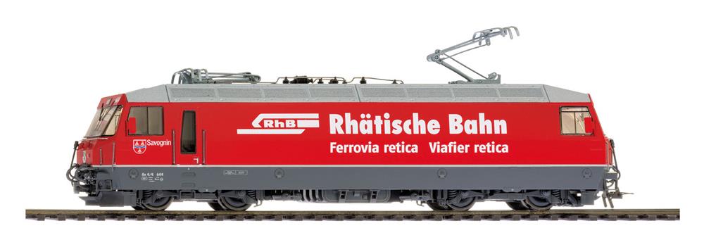 Modell einer Ge 4/4 III im aktuellen Corporate Design der RhB mit grossem Schriftzug "Rhätische Bahn" auf den Seitenwänden und Wappen der Gemeinde "Grüsch".