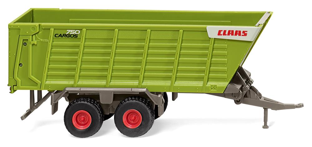Aufbau mit rückseitiger Ladeklappe in claasgrün. Stirnwand schwarz, Fahrgestell mit Deichsel sowie Kotflügeln umbragrau. Felgen rot. Seitlich vorn roter Claas-Schriftzug auf hellbeigen Grund. "Cargos"-Schriftzug schwarz, Typenzeichen „750“ in lichtgrau gehalten. Heckseitig ebenfalls roter Claas-Schriftzug auf hellbeigem Grund. Außerdem schwarzer "Cargos"-Schriftzug. Hinweis auf Höchstgeschwindigkeit auf schwarzweißem Zeichen. Rückseitige Leuchten rot bedruckt.