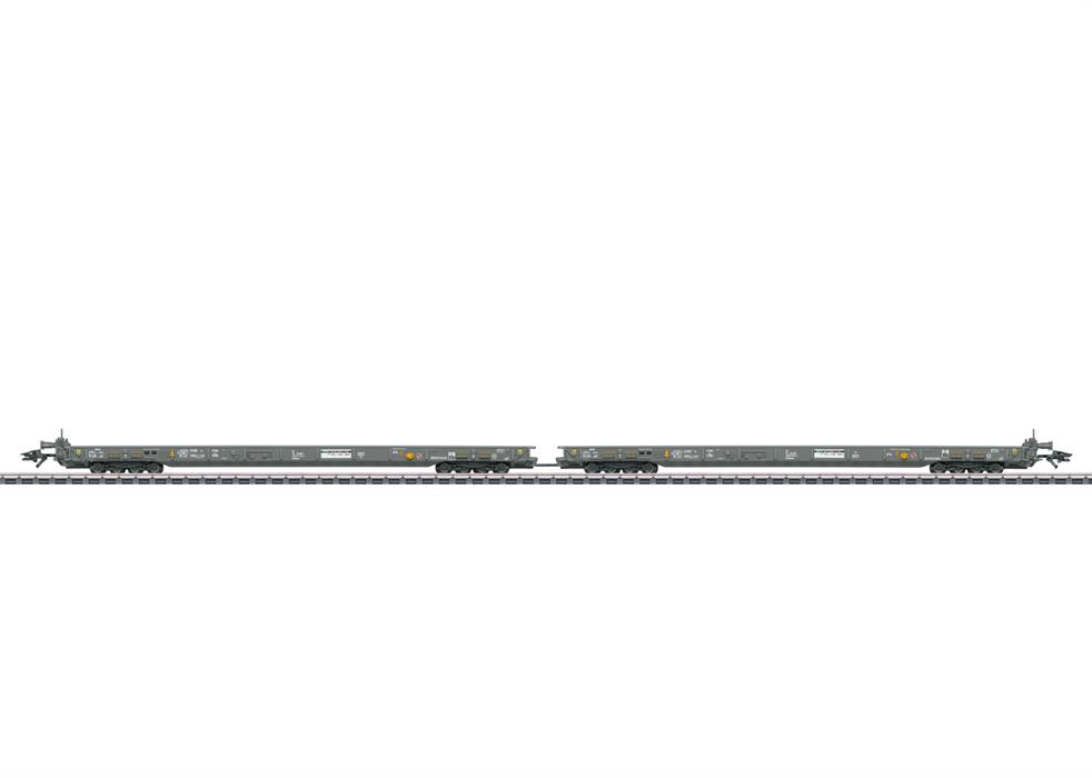 Modell: Wagenaufbau aus Metall. Mit zwei schwenk- und abnehmbaren Pufferbohlen. Haltekeile für LKW-Modelle, Sonderkupplungen für Niederflurwagen und Spezial-Kurzkupplungen zum Kuppeln an Fahrzeuge mit normaler Kupplung liegen bei. Auch an Fahrzeuge mit niedriger Pufferhöhe kuppelbar. Beide Wagen einzeln verpackt in zusätzlicher Umverpackung. Gesamtlänge über Puffer ca. 44,6 cm.