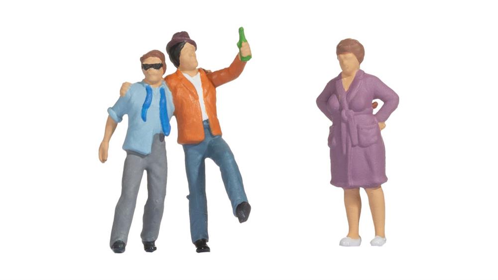 Mit Funny-Scenes “Saufbrüder” bringt NOCH eine amüsante und realitätsnahe Szene auf Ihre Modellbahnanlage! Diese Figurengruppe zeigt zwei gut gelaunte Freunde, die sich offensichtlich einen fröhlichen Abend gegönnt haben und nun Arm in Arm und mit einer Flasche in der Hand den Heimweg antreten. Doch die dritte Figur, eine resolute Dame im Bademantel, erwartet die beiden mit verschränkten Armen und einem kritischen Blick – ganz offensichtlich ist sie nicht begeistert vom nächtlichen Treiben ihrer “Saufbrüder”!