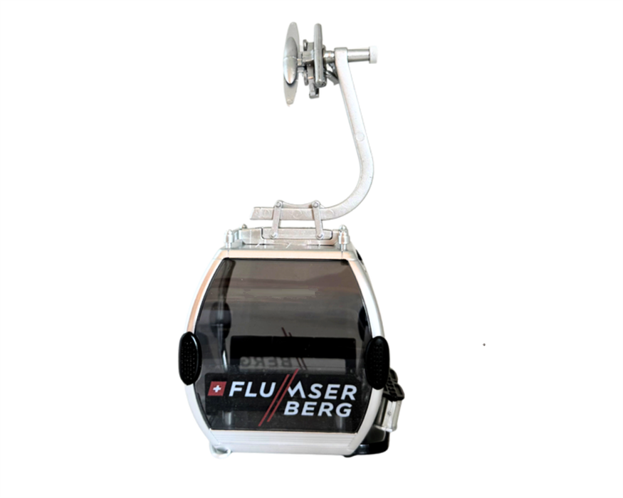 Omega IV Gondel für 8 Personen in silber mit Logo Flumserberg.