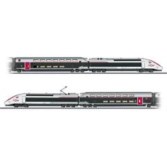 Modell: 4-teilige Grundgarnitur. Beide Triebköpfe (M1 und M2) motorisiert. Mit Digital-Decoder mfx+ und umfangreichen Geräuschfunktionen. Geregelter Hochleistungsantrieb in beiden Triebköpfen, zentral eingebaut. Jeweils 4 Achsen über Kardan angetrieben. Haftreifen. Serienmäßig eingebaute Innenbeleuchtung. Fahrtrichtungsabhängig wechselndes Dreilicht-Spitzensignal, 2 rote Schlusslichter und Innenbeleuchtung konventionell in Betrieb, digital schaltbar. Drittes Spitzenlicht für französischen Lichtwechsel digital separat abschaltbar (Lichtfunktion). Beleuchtung mit wartungsfreien warmweißen und roten Leuchtdioden (LED). Mit Pufferspeicher. Führerstände in den Triebköpfen mit Inneneinrichtung. Separat angesetzte Griffstangen aus Metall. Triebkopf und Übergangswagen sind paarweise fest miteinander gekuppelt, mit Spezial-Kurzkupplungen und Kulissenführung. Zusätzliche Kulissenführung im Jakobs-Drehgestell. Fahrtrichtungsabhängige Stromversorgung über den jeweils vorderen Triebkopf. Innenbeleuchtung wird versorgt über die durchgehende elektrische Verbindung des ganzen Zuges. Jeder Triebkopf mit 2 Einholm-Stromabnehmer in unterschiedlichen Ausführungen mit jeweils einer Wippe für DB und SNCF. Stromabnehmer sind nur mechanisch, nicht elektrisch funktionsfähig. Maßstäbliche Nachbildung, daher befahrbarer Gleisbogen ab Mindestradius 360 mm bei freiem Lichtraum.