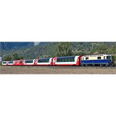 Wir realisieren die Panoramawagen des "Glacier Express" (GEX) als zweites Personenwagenmodell in der grossen Spurweite 0m in deren Ablieferungszustand. Die 2005/2006 bzw. 2009 bei der Firma Stadler hergestellten Panoramawagen haben neue Maßstäbe für den Komfort des weltberühmten Expresszuges gesetzt und dem Zug ein neues Erscheinungsbild in Rot und Gletscherblau mit weissem Schweizer Kreuz verliehen. Der Zug führt einen ganz in Rot gehaltenen bewirtschafteten Panorama-Servicewagen mit. Die Wagen wurden gemeinsam durch die benachbarten RhB und MGB beschafft und stellen das Wagenmaterial für mehrere Zugkurse zwischen St.Moritz/Davos über Andermatt und Brig nach Zermatt am Fusse des Matterhorns und zurück. In der Regel besteht ein GEX-Zug aus zwei Erst- und drei Zweitklasswagen sowie einem Servicewagen zwischen den beiden Wagenklassen.