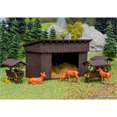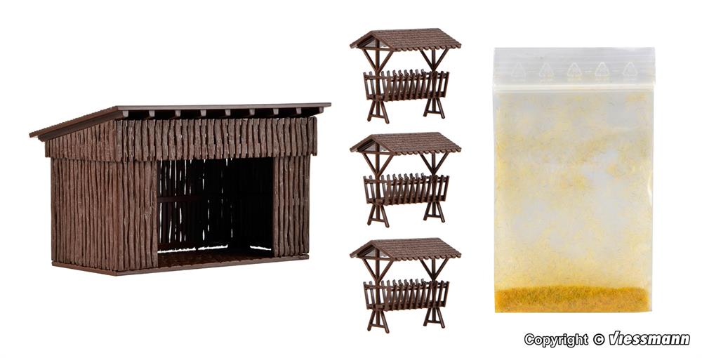 Der Bausatz besteht aus der Scheune und 3 Futterraufen.