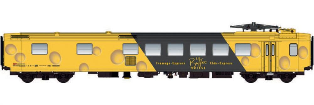 Modell gelb mit grünem Streifen, neuem Logo und Aufschrift "Le Buffet Suisse Chäs-Express".