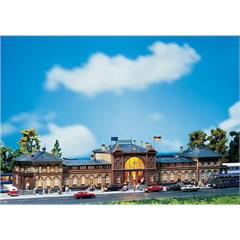 Viele Ausschmückungsteile, die das Bahnhofsbild realistisch beleben: Zuglaufanzeige, Lautsprecher, Uhren, Papierkörbe, Wagenstandsanzeigetafeln, Bänke, Fahrplantafeln, beleuchtbarer Kiosk, Kofferschliessfächer, Fahrkartenschalter und diverse Werbeschilder. Besonders interessante Effekte ergeben sich durch die Beleuchtung des mittleren Empfangsgebäudes. Ausserdem sind hier auch der Kiosk und die Fahrkartenschalter beleuchtbar. Die Zwischen- und Eckgebäude sind ebenfalls beleuchtbar. Der Aufbau dieses grossen Modells wird dadurch wesentlich vereinfacht, dass die 5 Gebäudekomplexe einzeln zusammengeklebt und erst dann zum Gesamtmodell zusammengestellt werden.