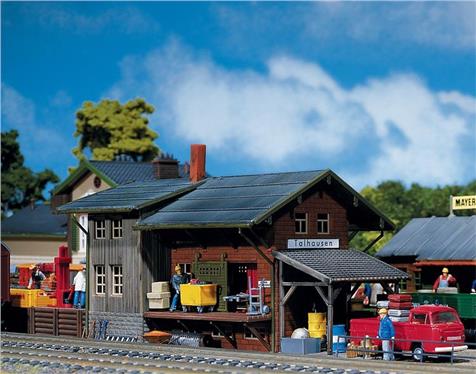 Güterbahnhof wie er auf dem Lande zu finden ist, mit Holzverschalung, Verladerampe und Vordach.