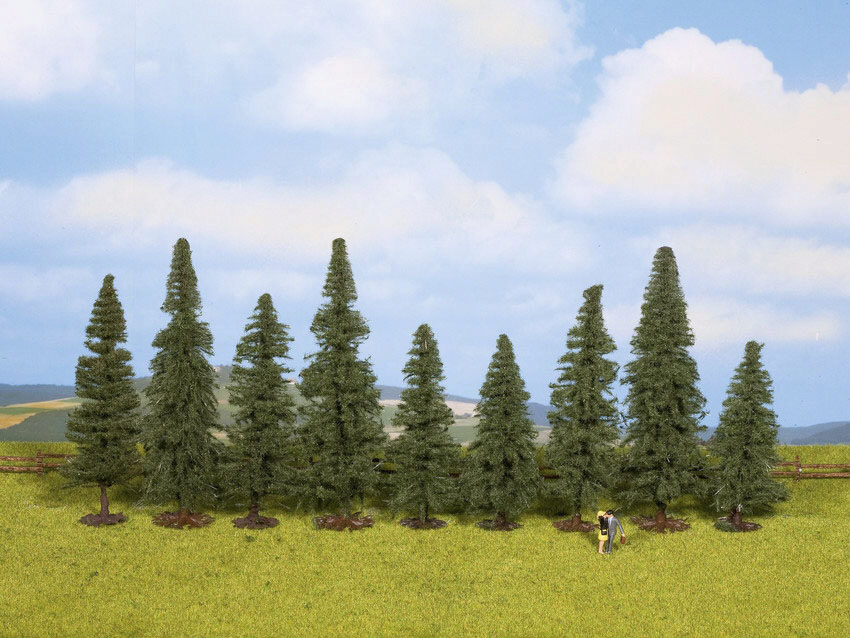 Das Set in der Spuren H0, TT, N und Z beihaltet 9 Tannen, die ca. 8 - 12 cm hoch sind. Die Tannen sind vielseitig einsetzbar: sowie in einer Winterlandschaft aber auch im Sommer verleihen Sie Ihrer Modellanlage eine lebendige Atmosphäre. Die Nadelbäume sind besonders nützlich, um Wälder, Berghänge oder naturnahe Szenerien nachzugestalten und passen hervorragend zu Szenarien mit Wildtieren oder Jagdszenen und fügen sich harmonisch in Nadelwälder ein.