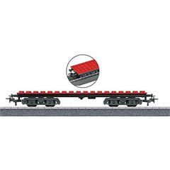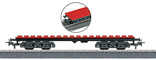 Modell: Vierachsiger Wagen mit Relex-Kupplungen. Der Wagenaufbau ist mit den geläufigen Noppen versehen, die zum Bau mit Bausteinen einladen. Länge über Puffer 16 cm. Gleichstromradsatz 4 x 700580.