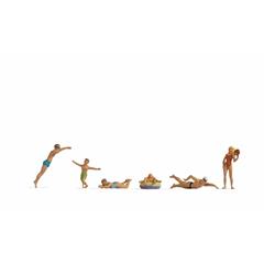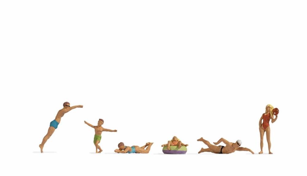 Das Set für die Spur H0 (Massstab 1:87, ca. 2 cm hoch) enthält zwei Männer, zwei Kinder und zwei Frauen, die unterschiedliche Badeaktivitäten durchführen: Einer der Väter taucht mit einem eleganten Köpfer ins Wasser ein, während der andere bereits sportlich krault. Eine Frau im hellblauen Badeanzug zieht ruhig ihre Bahnen, unterdessen hüpft ein Kind fröhlich im Wasser umher, während das andere entspannt auf einem Gummireifen treibt. Die Bademeisterin, gekleidet in einen typischen roten Badeanzug, steht aufmerksam am Rand und behält das Geschehen im Blick.